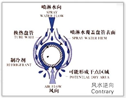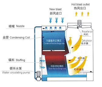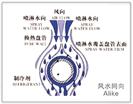 -工作原理: 工作流體(水,油或其他液體)在盤管中流動(dòng),盤管外壁被噴淋水包裹,流體的熱量通過(guò)管壁傳遞,與水和空氣行程飽和濕熱蒸汽,熱量由風(fēng)機(jī)排入大氣,噴淋水在循環(huán)的過(guò)程中通過(guò)PVC散熱片降低溫度,與新鮮入風(fēng)形成風(fēng)水同向流動(dòng),盤管主要依靠濕熱熱傳導(dǎo)方式,這樣的運(yùn)行原理的重要特點(diǎn)就是有效抑制盤管外壁的水垢生成。 |